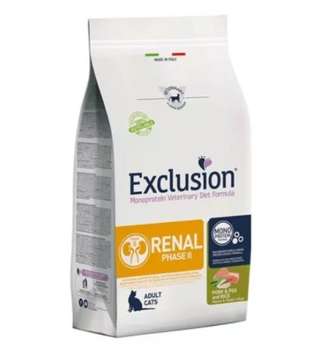 Az Exclusion egyfehérje Veterinary Diet Formula Renal egy egyfehérje összetételű, egyetlen alternatív állati fehérjeforrásból és egyéb innovatív összetevőkből készült, természetes tokoferolokkal tartósított diétás macskaeledel. Macskáknak krónikus veseelégtelenség esetén a vesefunkció specifikus táplálkozási támogatására és macskáknál az oxalátkövek képződésének csökkentésre.