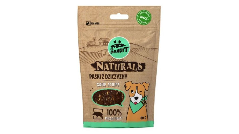 A Mr. Bandit Naturals – Vad egy egyetlen fehérjeforrás felhasználásával készült (monoprotein) kiegészítő eledel kutyának. 100% természetes jutalomfalat a legválogatósabb kutyusoknak is. Finom és ropogós csíkok – ízletes jutalom, amely több energiát ad a szórakozáshoz. Könnyen emészthető húsfalatok, melyek vitaminban és ásványi anyagokban gazdagok. Fehérjedús csemege. Ínyenc kutyusoknak is kitűnő választás.