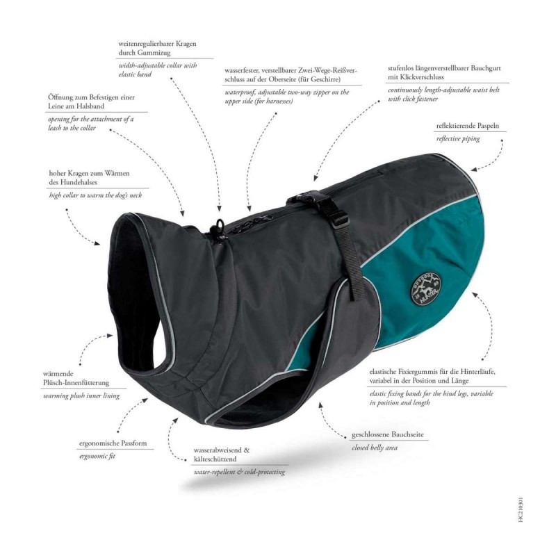 UPPSALA – Az optimális védelem, a maximális kényelem és a kifinomult dizájn tökéletes kombinációja. Intenzív fejlesztési folyamat eredményeként ezek az elegáns ruhadarabok ergonómikus illeszkedésükkel és különleges tulajdonságaikkal nyűgöznek le, amelyek szinte minden igényhez a megfelelő modellt kínálják. Az UPPSALA COZY sportos kutyakabát víz- és széltaszító, melegítő plüss belső bélésével pedig jobban megfelel a nagyon hideg vagy esős napokra. A zárt has oldala és a hátsó lábak rugalmas gumiszalagjai (változó pozícióban és hosszúságban) tökéletes illeszkedést biztosítanak, függetlenül a kutya testtípusától. A kutyakabát gallérja rugalmas szalaggal állítható. A gallér D-gyűrűjének nyílása mellett a kabát a vízálló és egyénileg állítható kétirányú cipzárnak köszönhetően "edényhordozók" számára is ideális. A fokozatmentesen állítható deréköv kattanással teljes rugalmasságot garantál – a fényvisszaverő cső pedig jó láthatóságot biztosít még nehéz látási viszonyok között is. 30°C-on mosható.